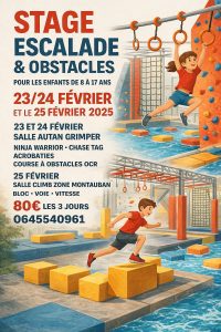 23 24 et 25 Février 2026 Retrouvez ici toutes les informations sur les stages, l’organisation des stages et les formulaires d’inscription. STAGE ESCALADE/OBSTACLES (23/24/25 Février 2026) Autan Grimper vous propose un stage d’escalade / obstacles sur 2 jours à la salle Liv Sansoz de BessièresEt 1 jour à Climb Zone Montauban.Stage ouvert aux enfants âgé […]